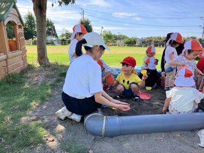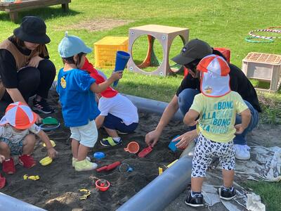 保育室のおもちゃを貸し借りしたり、砂場で一緒に型抜き遊びをしたり・・・お友達とのやりとりを楽しむことができました。