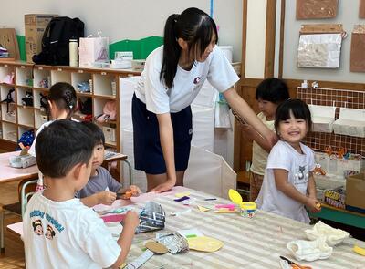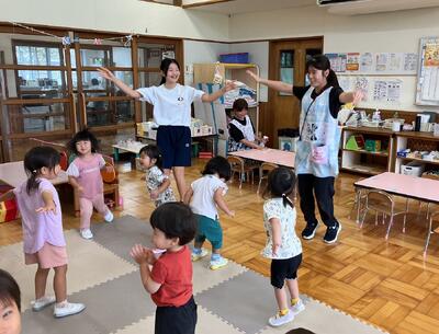 初めての夏休みを異年齢で過ごす年少さんは、初めは恥ずかしがっていたものの、慣れてくるとお兄さん、お姉さんへの憧れの気持ちがもてるようになり、自分から「入れて」と仲間入りする子が増えてきました💑