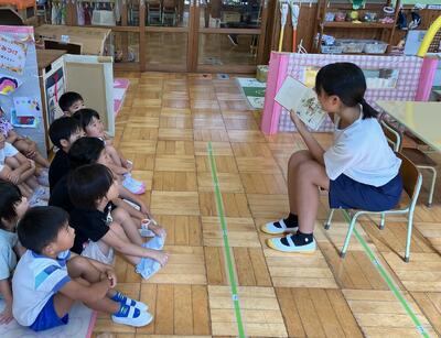 園長先生が「夏休みはどんなことをしたのかな?」と問いかけると